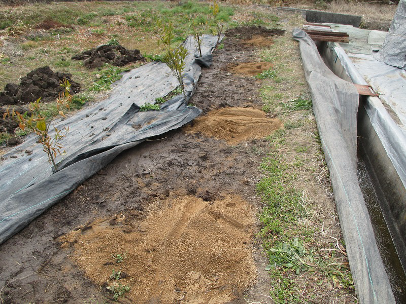 土の後は牛糞堆肥を同じように1輪車で運んで、ようりんと苦土石灰を混ぜ込んで植え付け準備は完了しました。