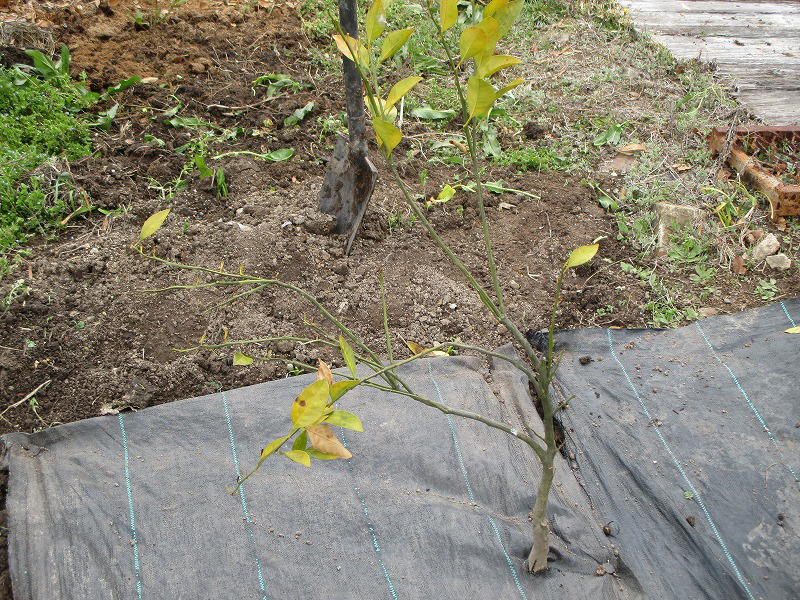 いい加減な植え付け方をしていた事もあって、葉の色が薄茶色くなって、とても柑橘系の葉の色とは